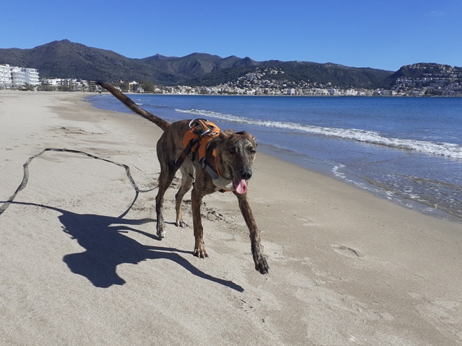 Entonces we moved down the coast stopping off quickly in Pezenas to catch up with a friend called Dottie the labrador. We had great fun zooming around a vineyard whilst the humans droned on about travels. And now we're near Roses in Espana. Last week I visited Doris's favourite spot in Cadaques and ate some seaweed. Not sure I was supposed to do that but apparently I have no decorum, muy bien Cilla! The beaches are stony there so I was glad to get to Roses for some sandy speed digging and serious running. Infact the beach is so big and perfect it's almost fake.