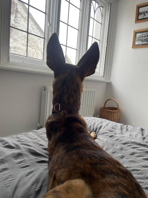 As a pup I was dumped with some others in a cage at the side of the road near Malaga, Spain We were locked in without food or water and it took a while for someone to find us. So much so that by then I had lost part of my nose from trying to escape and had a nasty infection. After this I didn't really trust people, in fact I was terrified. With mucho love and help from Elaine I have grown to like quite a few people. The lady that gives me treats at the cafe each morning, the family who visit the island a lot and of course Elaine and himself. I call him Big Dog and he's the bestest fun ever (he let's me on the bed). Bed is cama to us Spanish hounds and I bark 'cama, cama, cama' whilst spinning and rearranging the pillows. This is allowed everywhere in the UK no?! I think if I were allowed on the big bed more I would be even more waggy. Right off to barge the bedroom door in capering hope.
